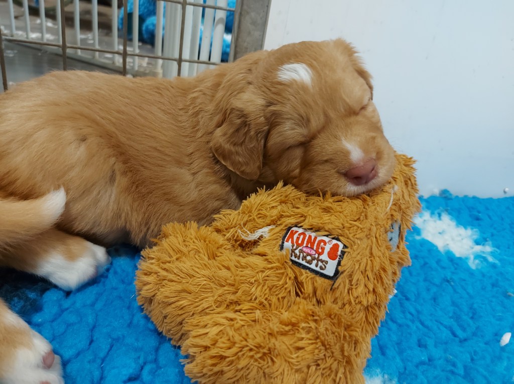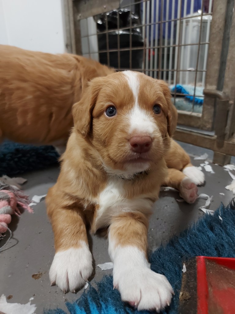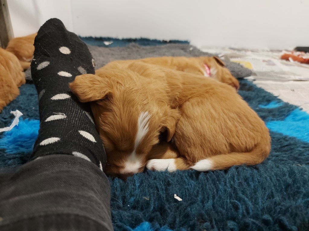 At the time of writing they are almost 5 weeks old and full of life and vigor! They’re such playful, cheeky little bundles of fluff. We’ve started the very basics of toilet training – encouraging them to toilet on the newspaper and not on their bed. Getting them used to the idea of toileting in a certain area/ on a specific material teaches them to hold the urine/poo until they reach the toilet area, which makes them much easier to toilet train when they get to their new homes. They’ve been raised in a noisy area, where they’ve become very familiar to the sounds of dogs barking, vans/cars, washing machines/tumble dryers and very frequent comings and goings. They’ve now moved into our kitchen, where they’ll still hear these sounds but now also have more exposure to more household events like cooking and hoovering.