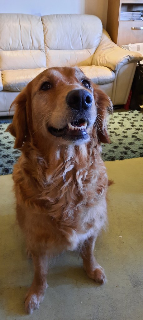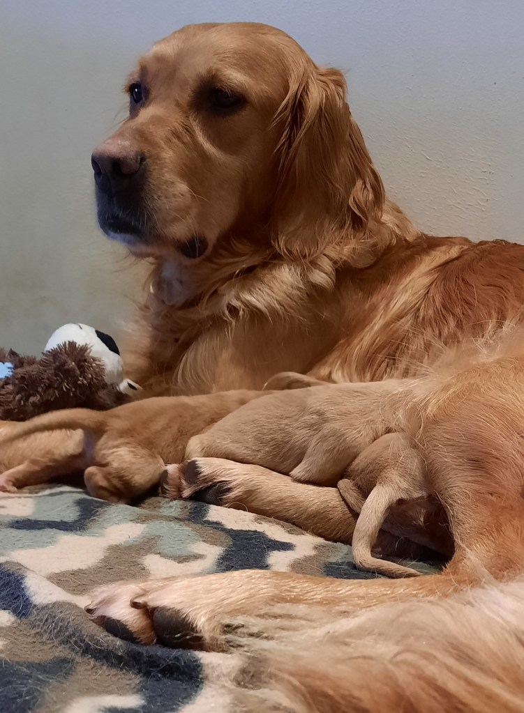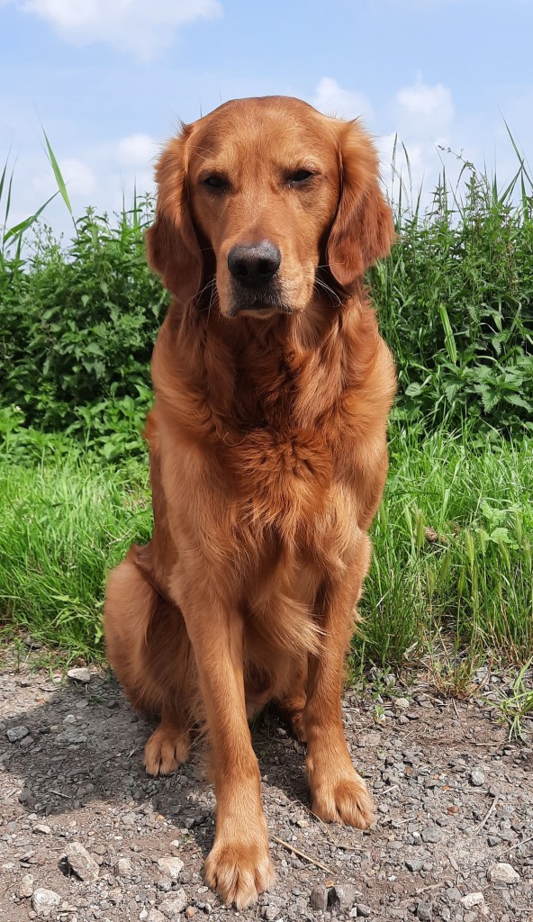 Barley (KC name: Fielddale Lapwing) is the mother of Genie and Willow. She’s a nicely put together dog with a nice broad head, and a dark yellow, soft double coat. Her temperament is excellent, she’s a reliable, steady dog whom all the other dogs look up to.